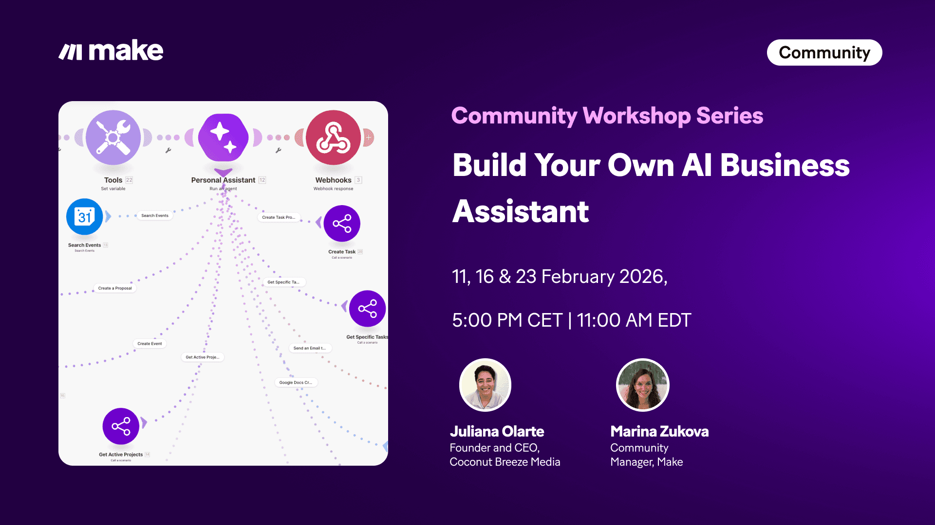 ℹ️ In this 3-part workshop series, you’ll build a complete AI business assistant from the ground up using Make and Make's New AI Agent — led by Juliana Olarde, a valued community member and Master of Make - winner of a Make community challenge. Juliana is also the Founder & CEO of Coconut Media, where she builds practical AI systems for real businesses.